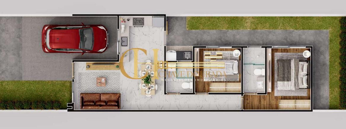 2 Dormitórios, sendo 1 suíte1 Banheiro1 Cozinha1 Sala de estar1 Área de serviço