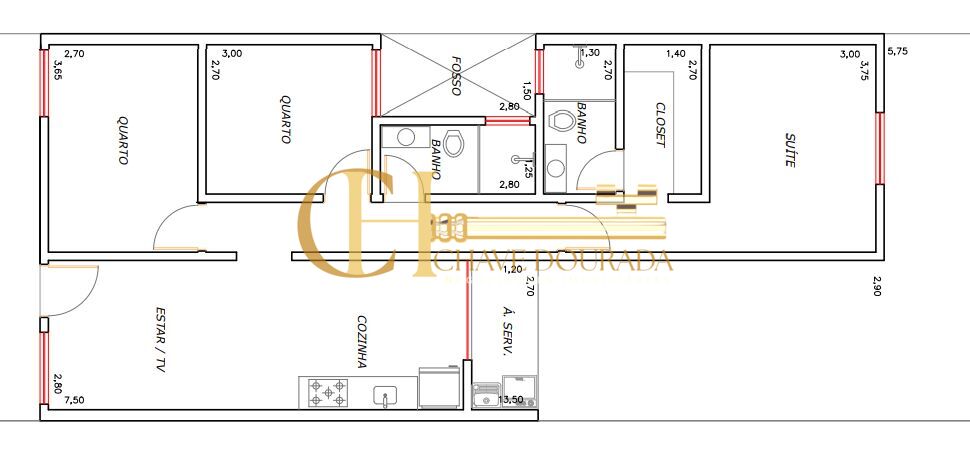 3 Dormitórios, sendo 1 suíte1 Banheiro1 Closet1 Cozinha1 Sala de estar1 Área de serviço